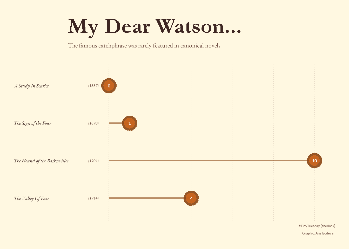 This week challenge dataset in on Sherlock. Check the TidyTuesday GitHub repo for the data.