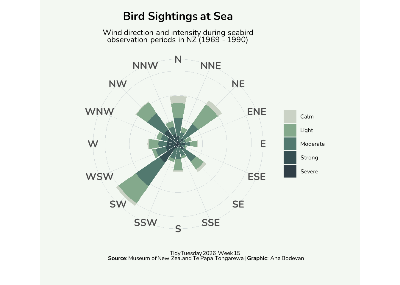 subtitle <- "Wind direction and intensity during seabird observation periods in NZ (1969 - 1990)"